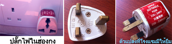 ปลั๊กไฟ ที่ฮ่องกงใช้พลังงานไฟฟ้าเท่ากับประเทศเรา คือ 220 วัตต์ แต่ดันใช้ปลั๊กแบบสามขา พวกเราโชคดีที่ทางโรงแรมฯ มีให้ยืม (หนึ่งอัน ต่อหนึ่งห้อง) แต่ถ้าหากทางโรงแรมไม่มีให้ยืม ก็สามารถหาซื้อได้ที่สนามบินฯ หรือ ที่ร้านค้า (ที่ตลาดกลางคืน Temple Night Street Market) สนนราคาประมาณ $20-$35 เหรียญฮ่องกง