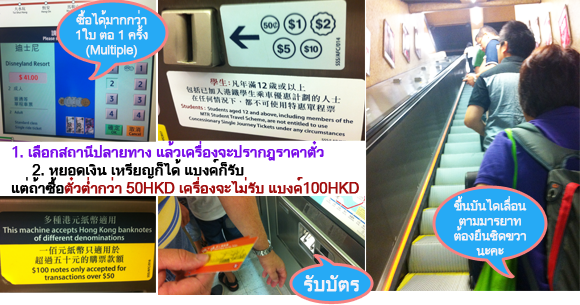 ตู้จำหน่ายตั๋วรถไฟฟ้าใช้ง่าย แต่บางอย่างก็ต้องอ่าน รายละเอียดเพิ่มเติม เช่น หากซื้อตั๋ว หลายๆใบพร้อมกัน (multiple) แต่หากราคารวมกันแล้วไม่ถึง 50 ดอลล่าร์ฮ่องกง ตู้ก็จะไม่รับแบงค์ 100ดอลล่าร์ฮ่องกง ค่ะ